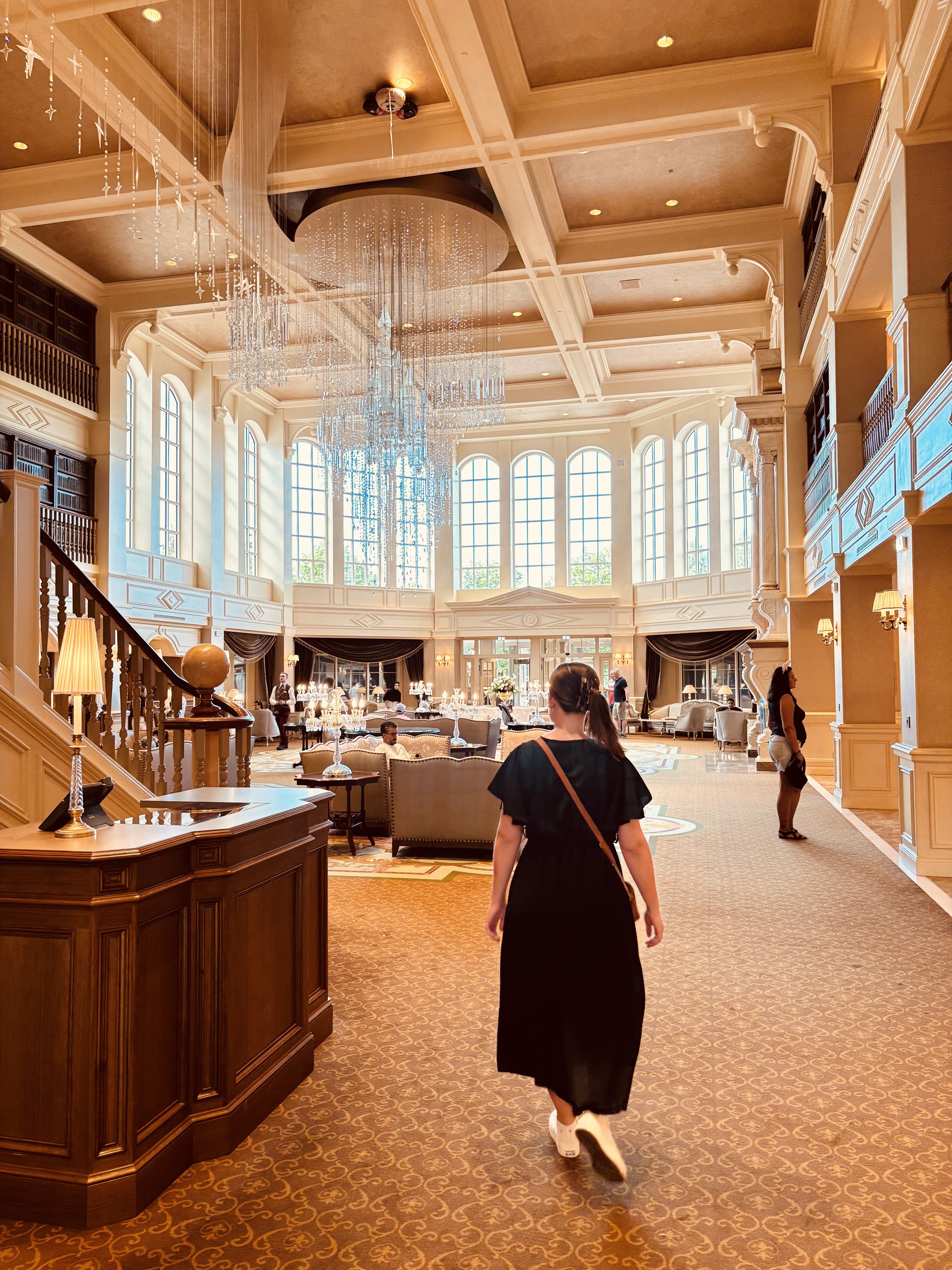 Wanneer je het Disneyland Hotel binnenloopt, voelt het alsof je een klassiek Disney-sprookje instapt. De Victoriaanse stijl is meteen zichtbaar. Hoge plafonds, gouden details, zachte tinten, schilderijen van prinsessen, houtwerk en grote kroonluchters. Alles is prachtig gedecoreerd zonder overweldigend te zijn. Je merkt dat het hotel compleet vernieuwd is, maar de ziel is behouden. Het is nog steeds dat iconische Disney-hotel, alleen verfijnder, rustiger en harmonieus in kleur en verlichting.