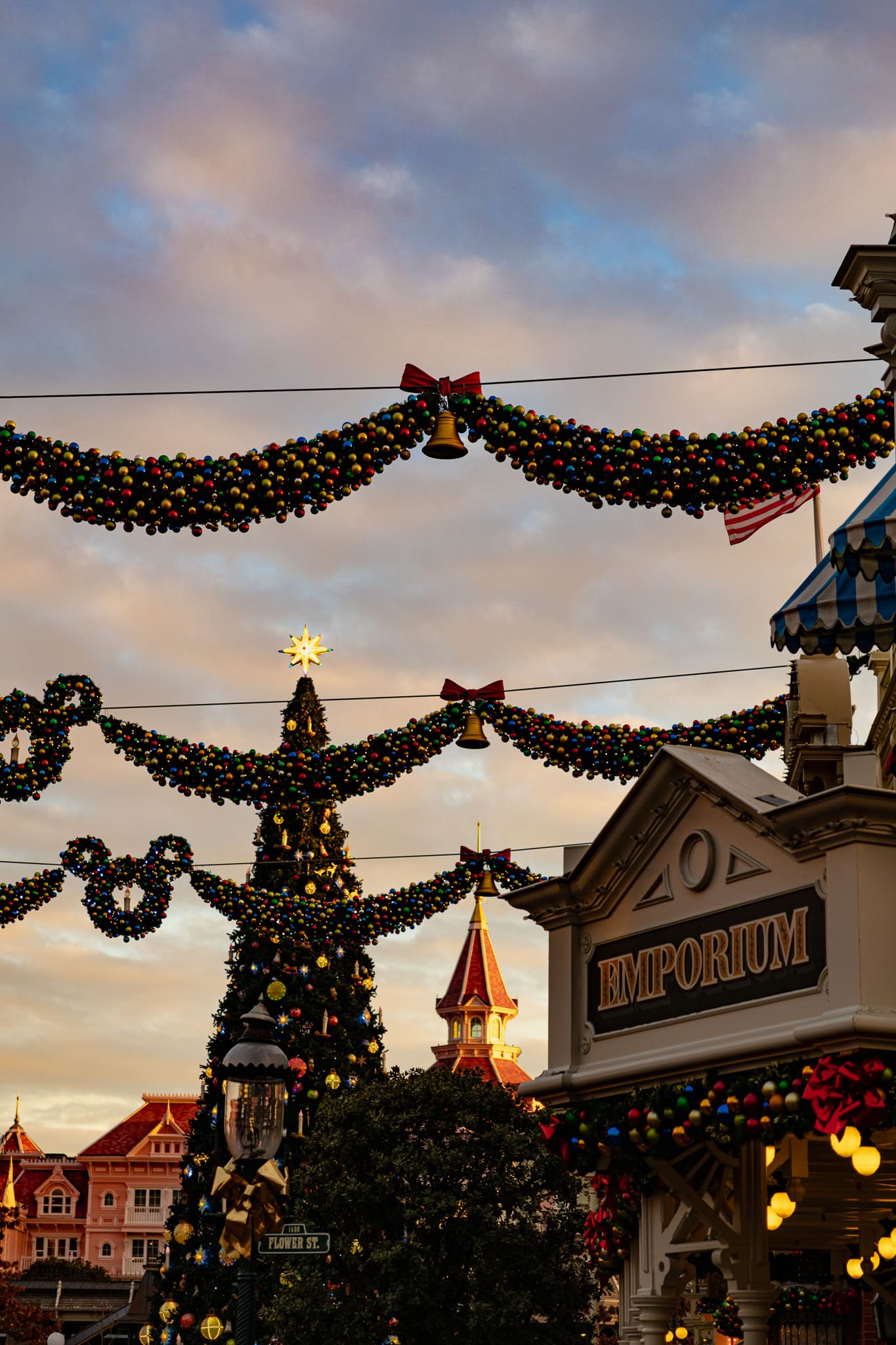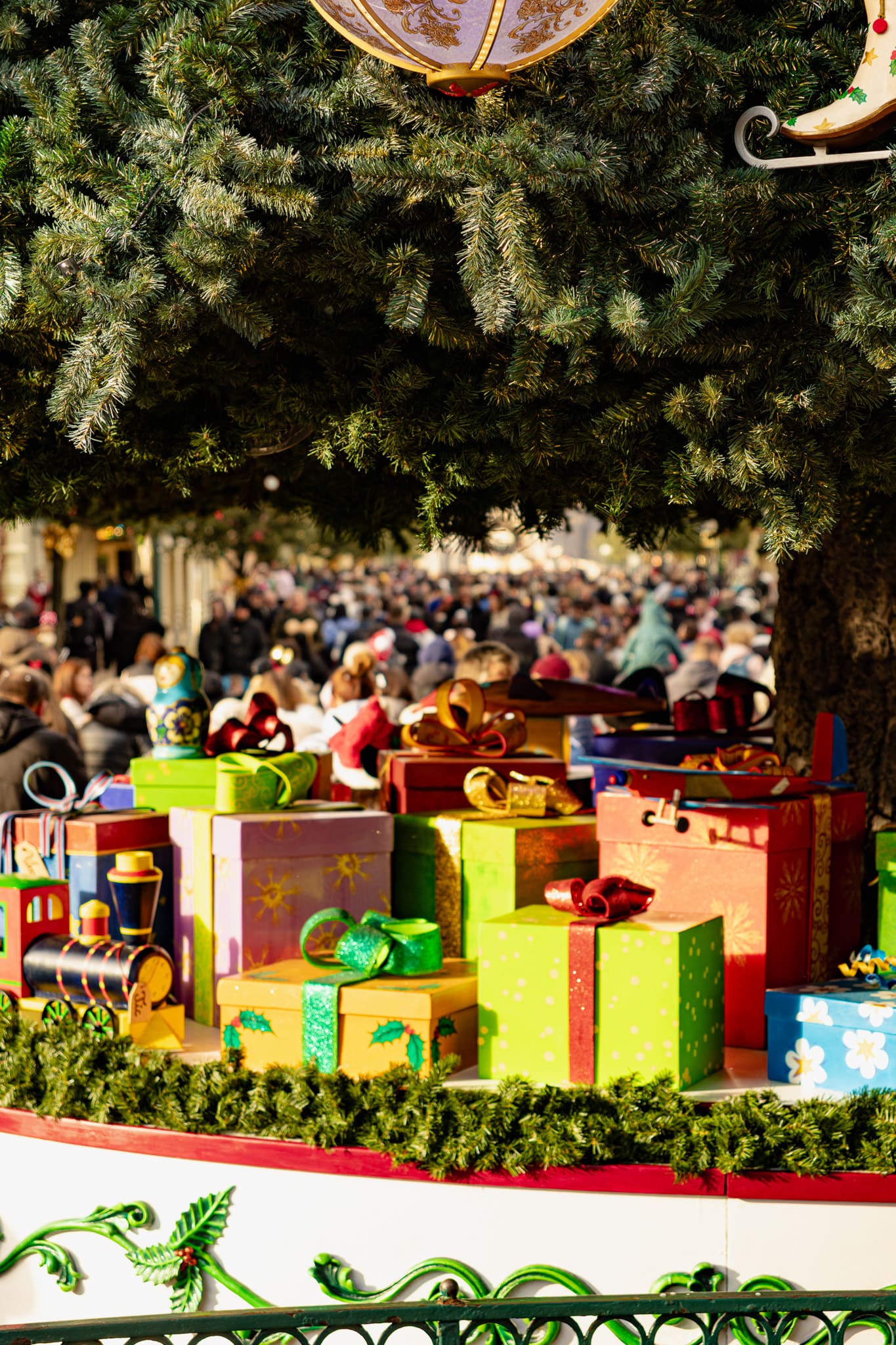 Nadat je de toegangspoorten van het Disneyland Park bent gepasseerd, loop je direct de kerstsfeer tegemoet. Het treinstation is, zoals elk jaar, rijk versierd met linten, kransen en duizenden lichtjes — een feestelijk welkom dat meteen de toon zet.